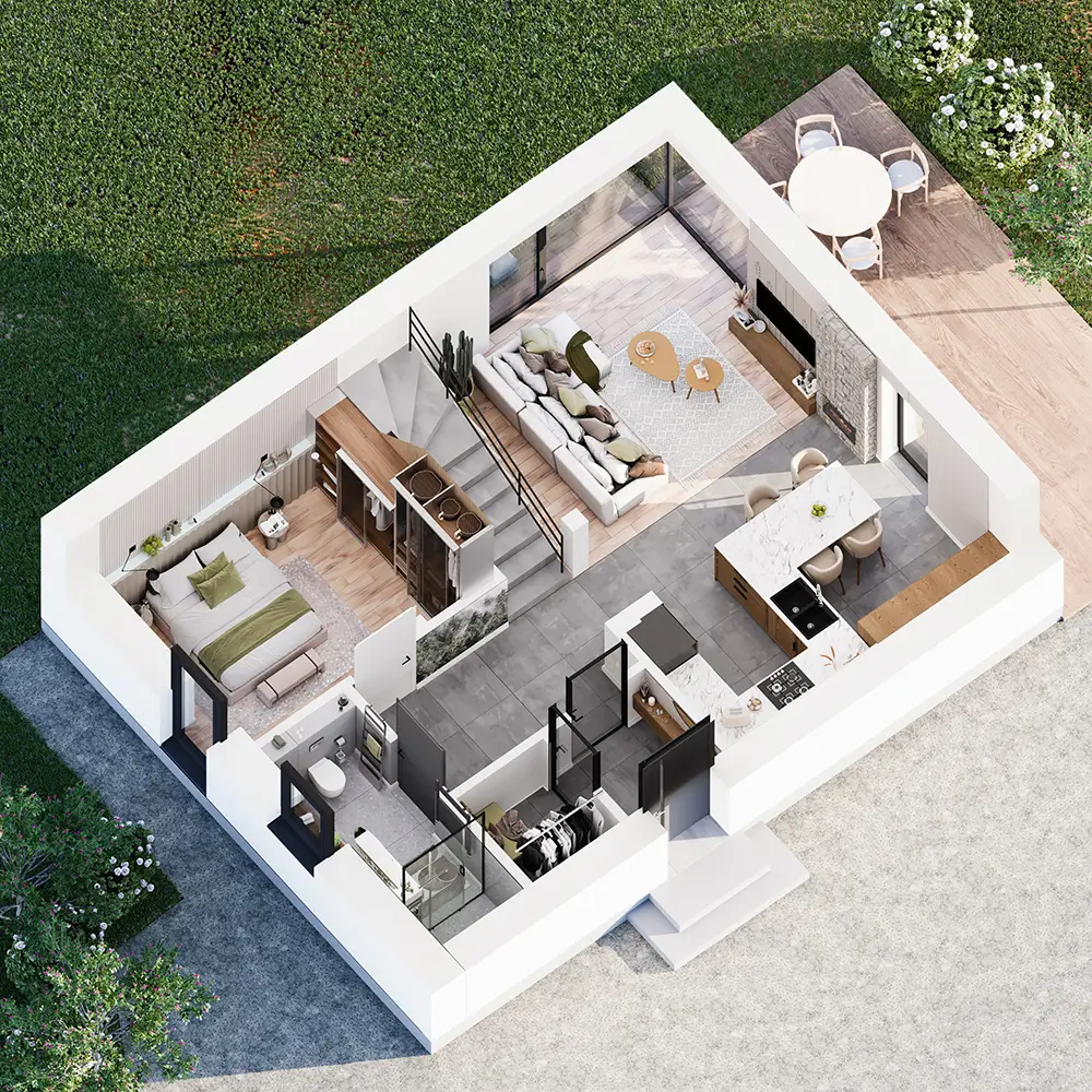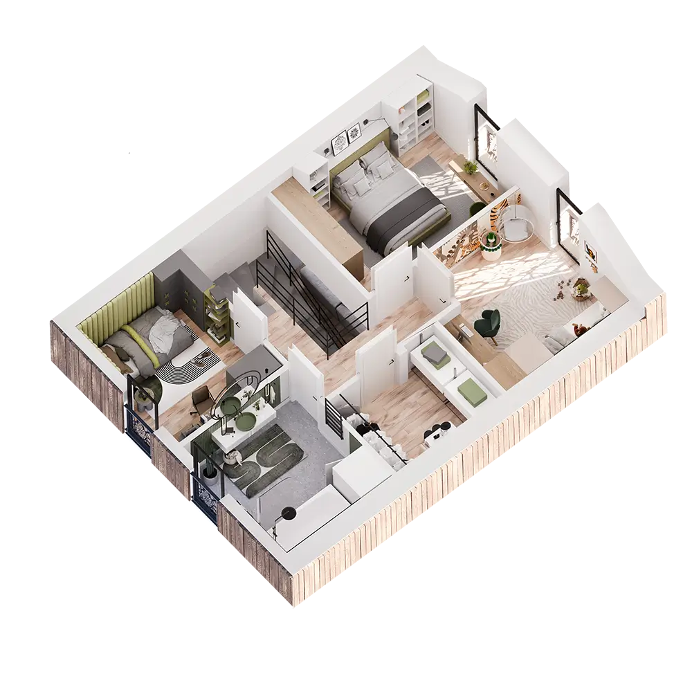 Każdy z budynków to przemyślany projekt, w którym dopracowano każdy detal – od ergonomicznego i praktycznego układu wnętrz, po wysokiej klasy materiały wykończeniowe wzbogacone o nowoczesne technologie. Domy oferują pięć przestronnych pokoi, w tym jasny salon z aneksem kuchennym, cztery pokoje do własnej aranżacji, dwie komfortowe łazienki, garderobę oraz pomieszczenie techniczne.