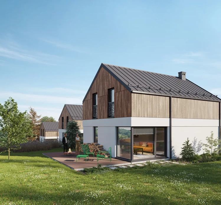 Dla wygody mieszkańców przed każdym domem zaplanowano miejsce parkingowe, osłonięte wiatą oraz wystarczającą przestrzeń do zaparkowania drugiego samochodu. Elegancji budynkom dodają starannie dobrane materiały: trwały tynk sylikatowy na elewacjach, efektowna okładzina na piętrze oraz trzyszybowe okna zdobione barierką z tradycyjną parzenicą – symbolem regionu, który podkreśla unikalny charakter inwestycji.