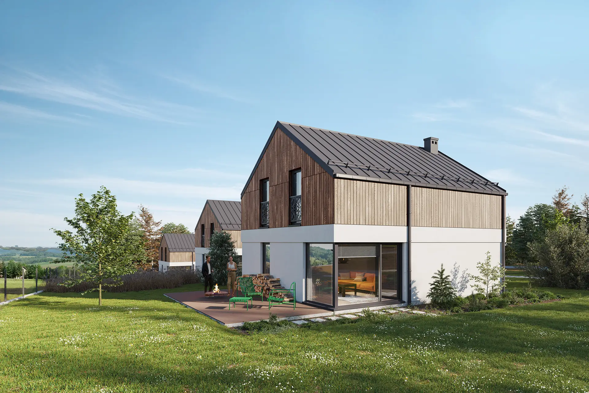 Dla wygody mieszkańców przed każdym domem zaplanowano miejsce parkingowe, osłonięte wiatą oraz wystarczającą przestrzeń do zaparkowania drugiego samochodu. Elegancji budynkom dodają starannie dobrane materiały: trwały tynk sylikatowy na elewacjach, efektowna okładzina na piętrze oraz trzyszybowe okna zdobione barierką z tradycyjną parzenicą – symbolem regionu, który podkreśla unikalny charakter inwestycji.