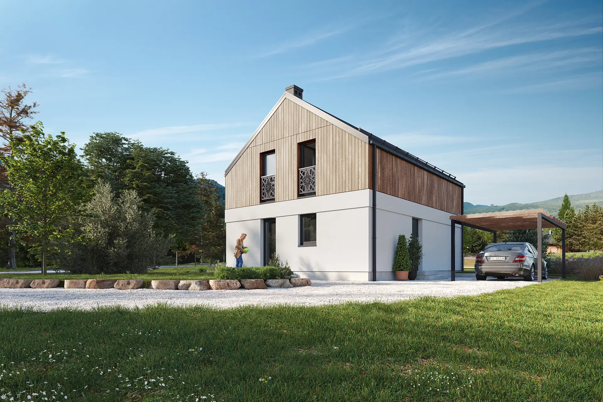Jedno zadaszone miejsce postojowe w cenie domu.